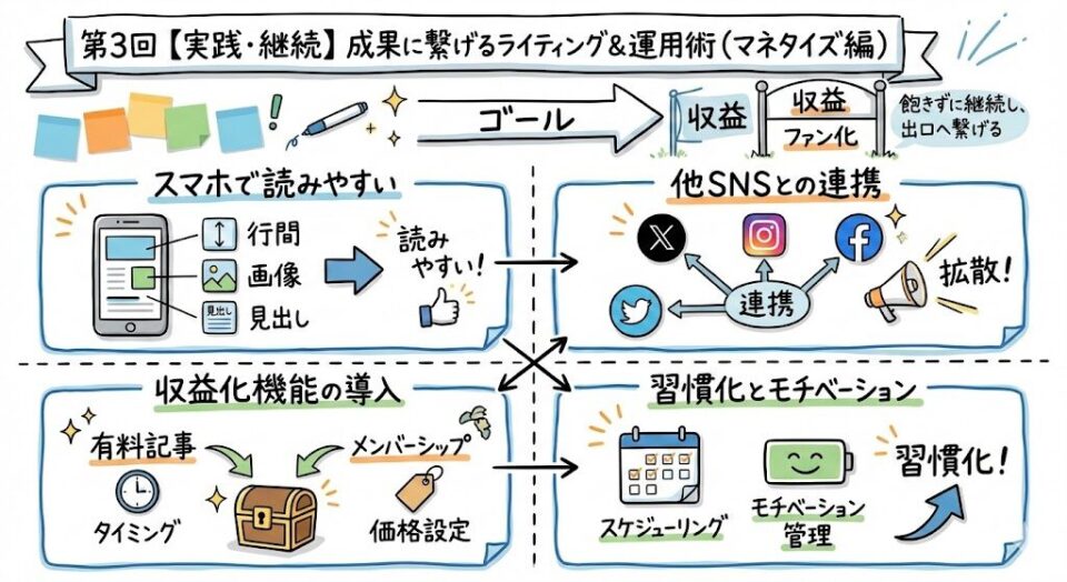 | 3回目 | マネタイズ編 | 【実践・継続】成果に繋げるライティング&運用術 |