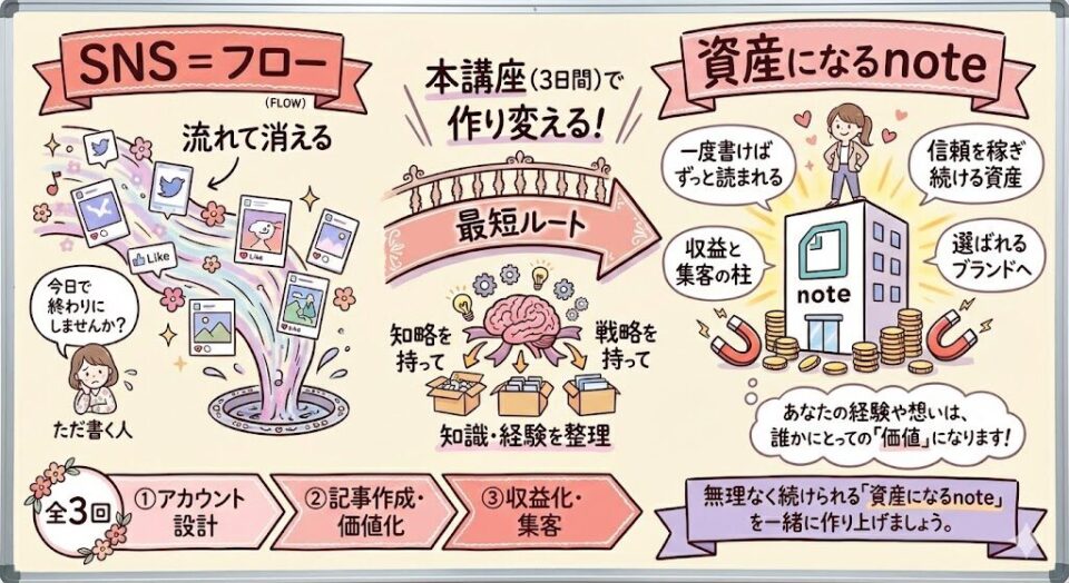 本講座は、あなたの頭の中にある知識や経験を整理し「一度書けばずっと読まれ続け、信頼を稼ぎ続ける資産」へと作り変えるための3日間です。