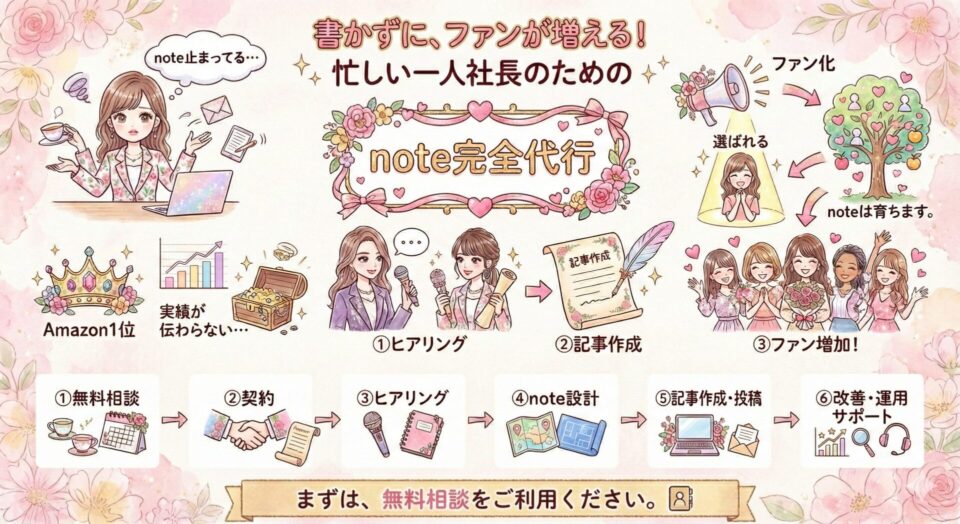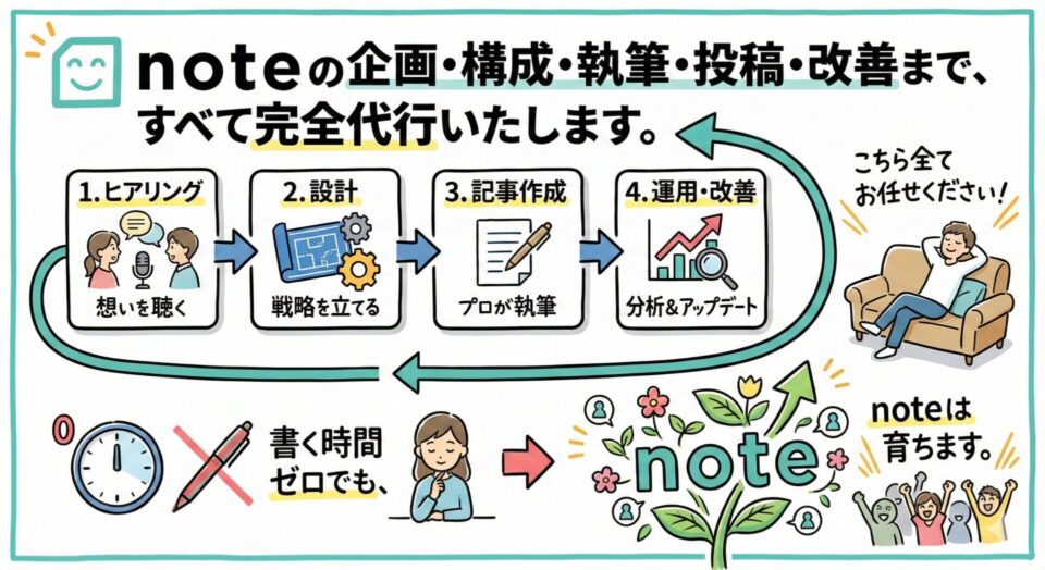 noteの企画・構成・執筆・投稿・改善まで、すべて完全代行いたします。